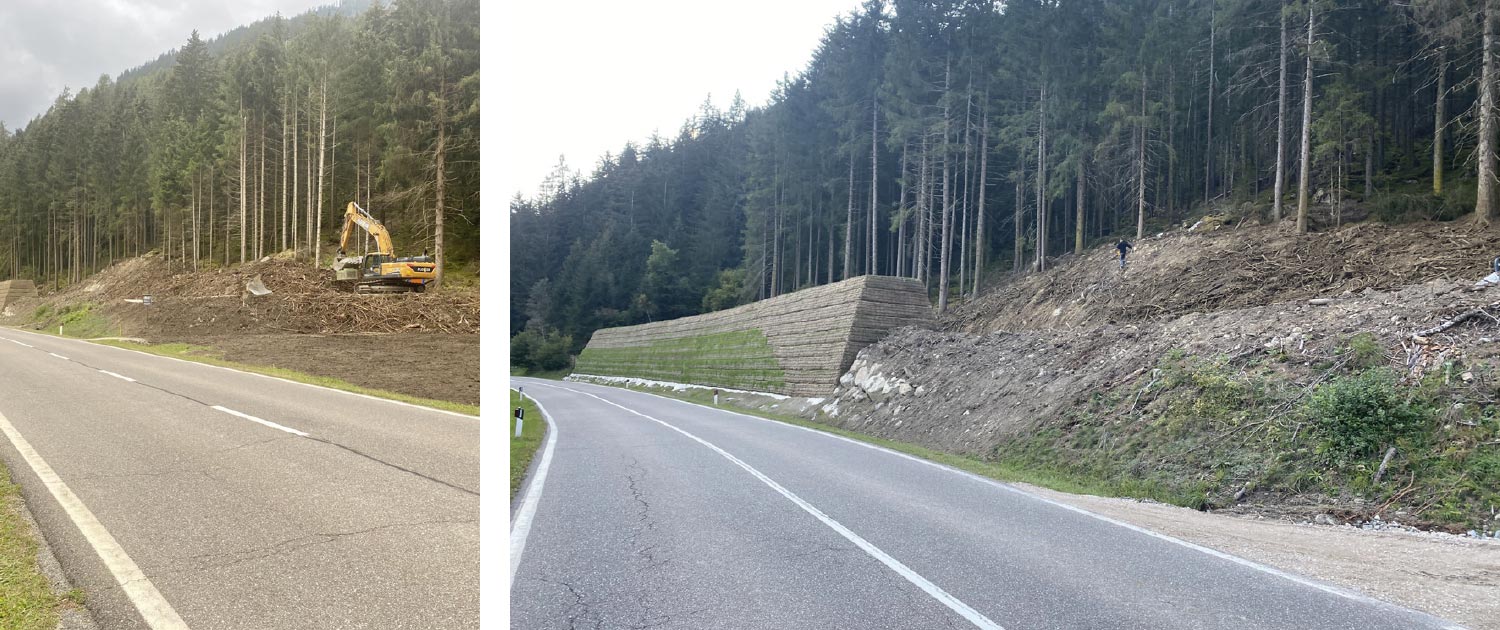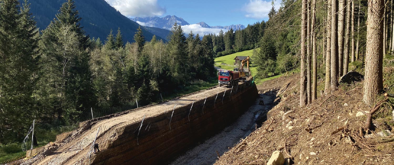 Per proteggere la strada provinciale della Valle di Anterselva dalla caduta di massi, è stata costruita parallelamente alla strada stessa una struttura di protezione in terra armata lunga 90 m e alta 6 m. Grandi quantità di acqua di infiltrazione sono state drenate attraverso tubi di drenaggio adeguatamente dimensionati. Per poter utilizzare il materiale di riempimento esistente, prima di essere posato è stato mescolato con ghiaia riciclata.