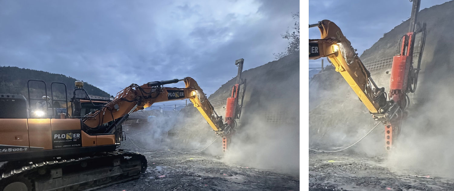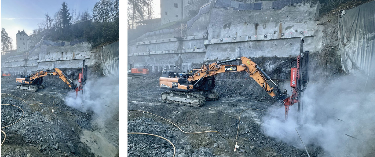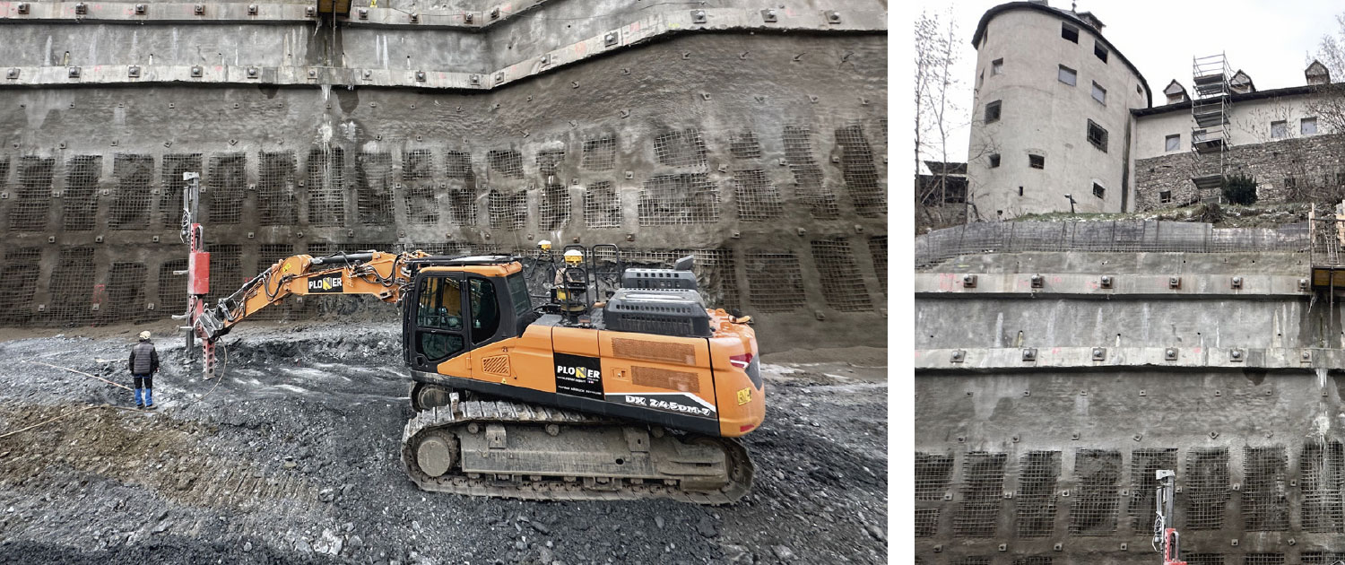 Aushub- und Sprengarbeiten für die zu errichtende Tiefgarage unter dem Schloss Sonnenburg. Um die Erschütterungen nahe dem Schloss und den mittelalterlich-wertvollen Gewölben wurde durch 382 kleineren Sprengungen und Hammer die rund 6.000m3 Fels bis zur 13m tiefen Baugrubensohle herausgearbeitet.